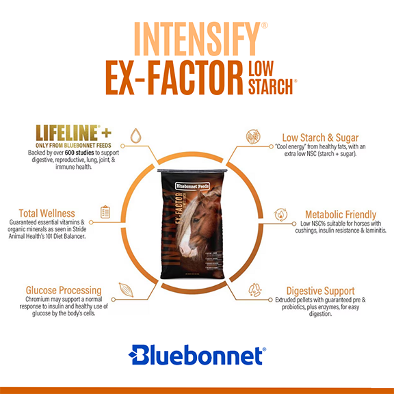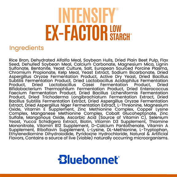 Categories Bluebonnet Feed, Horse Feed, Horses, Intensify® Ex-Factor® Low Starch
