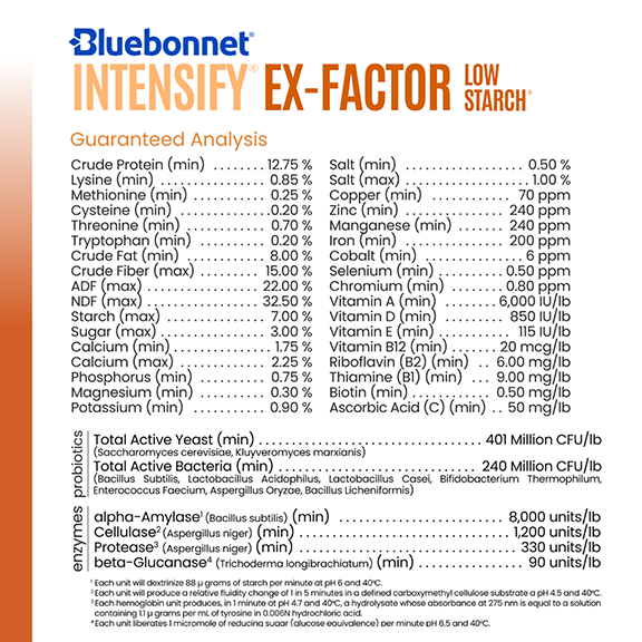 Intensify Ex-Factor Low Starch is highly digestible, goes through a specialized extrusion-cooking process, and is formulated specifically for horses with starch and sugar sensitivities or metabolic conditions.