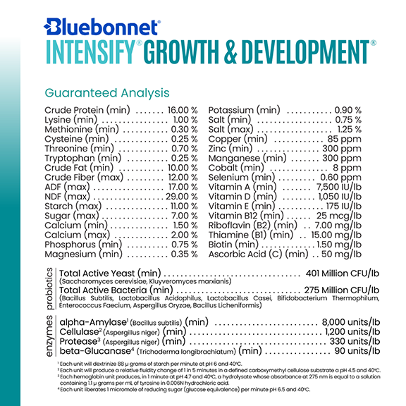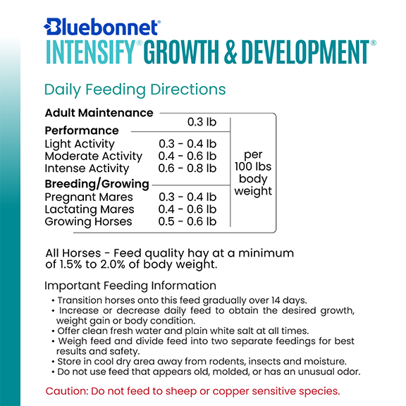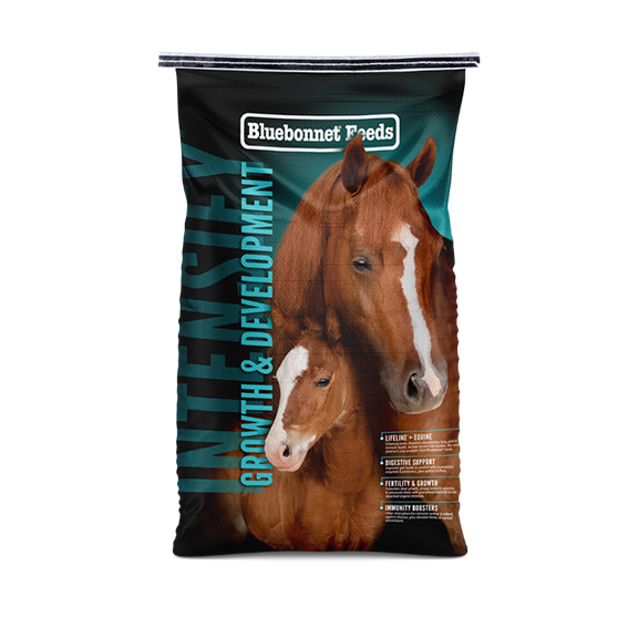 Intensify Growth & Development promotes healthy growth rates, strong bones and muscles, improved stress management, plus enhanced immunity and disease defenses, with: guaranteed biotin, easily absorbed organic minerals, Lifeline+ Equine (only from Bluebonnet Feeds), advanced digestive support, and more!